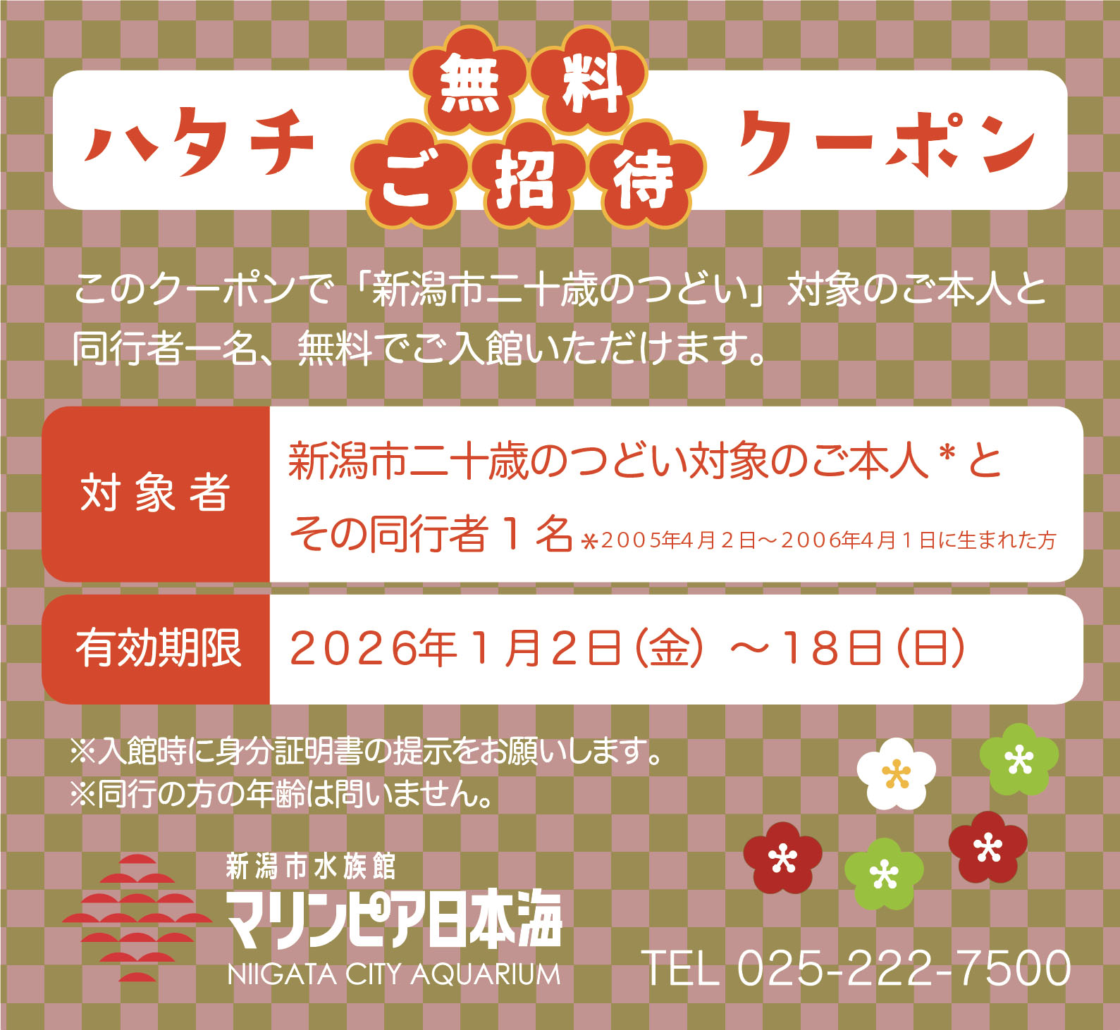 新潟市水族館マリンピア日本海より、今年度の新潟市二十歳のつどい対象の方へプレゼントです🎁
