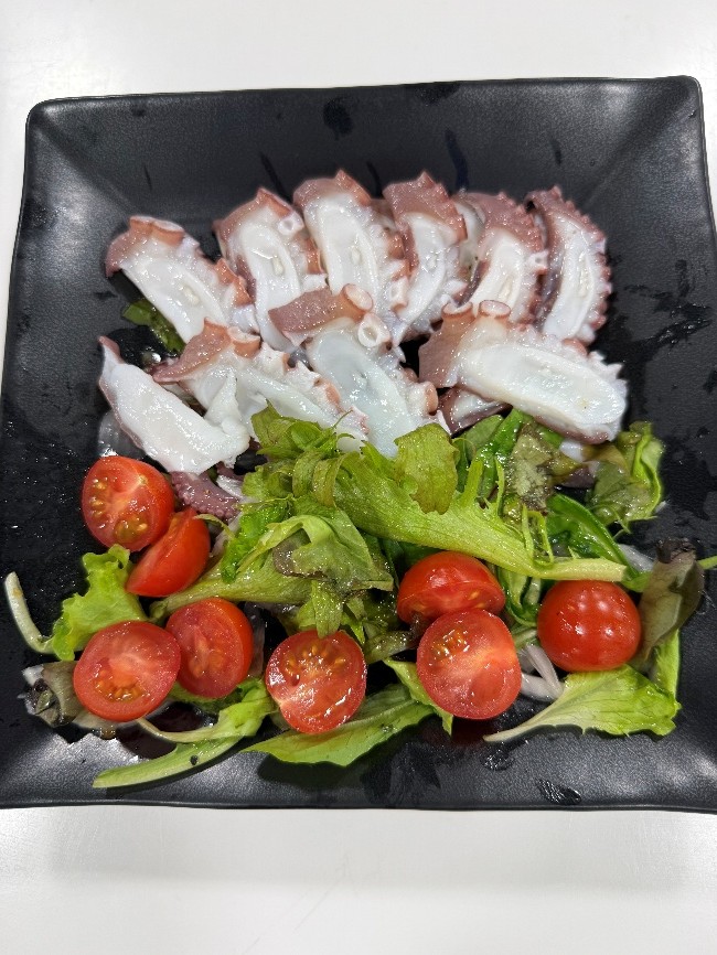 料理人の経験を持つ漁師の島谷さんが講師を務め、茹でられたマダコとベビーリーフやミニトマトなどを合わせてマダコのカルパッチョをつくりました。