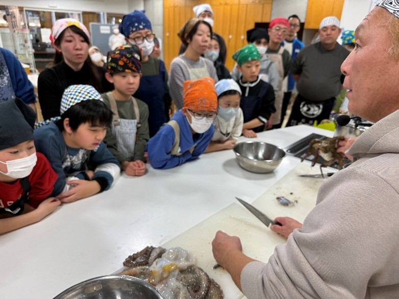 2人の漁師さんによってさばかれると、調理台を囲んだ親子からは生きた動くマダコの様子に歓声も上がりました。