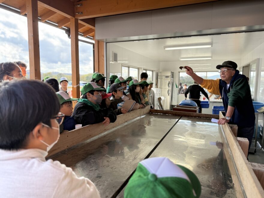 鮭が遡上する村上市の三面川を訪れ、伝統的な居繰網漁(いぐりあみりょう)を 見学したほか、イヨボヤ会館では現在の鮭を取り巻く環境問題について考えました。